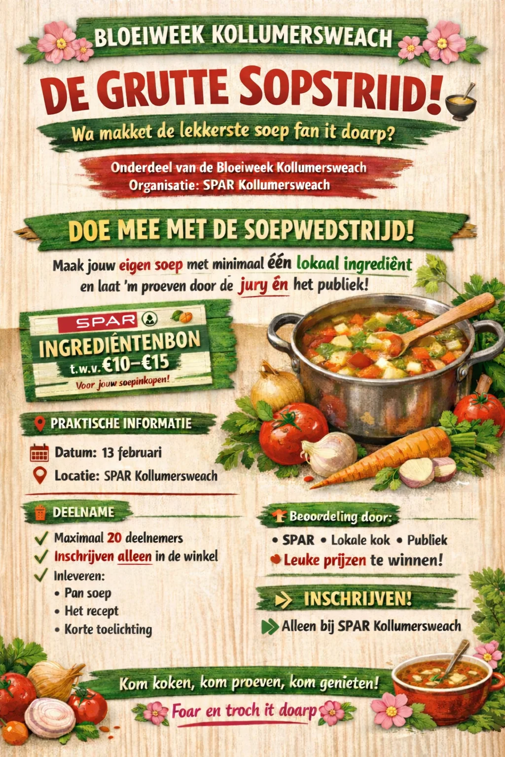 𝗗𝗲 𝗚𝗿𝘂𝘁𝘁𝗲 𝗦𝗼𝗽𝘀𝘁𝗿𝗶𝗶𝗱 – 𝗕𝗹𝗼𝗲𝗶𝘄𝗲𝗲𝗸 𝗞𝗼𝗹𝗹𝘂𝗺𝗲𝗿𝘀𝘄𝗲𝗮𝗰𝗵 & 𝗙𝗲𝗮𝗻𝗸𝗹𝗲𝗮𝘀𝘁𝗲𝗿! Doe mee aan De Grutte Sopstriid tijdens de Bloeiweek in Kollumersweach! Laat zien dat jij de lekkerste soep van het dorp kunt maken
