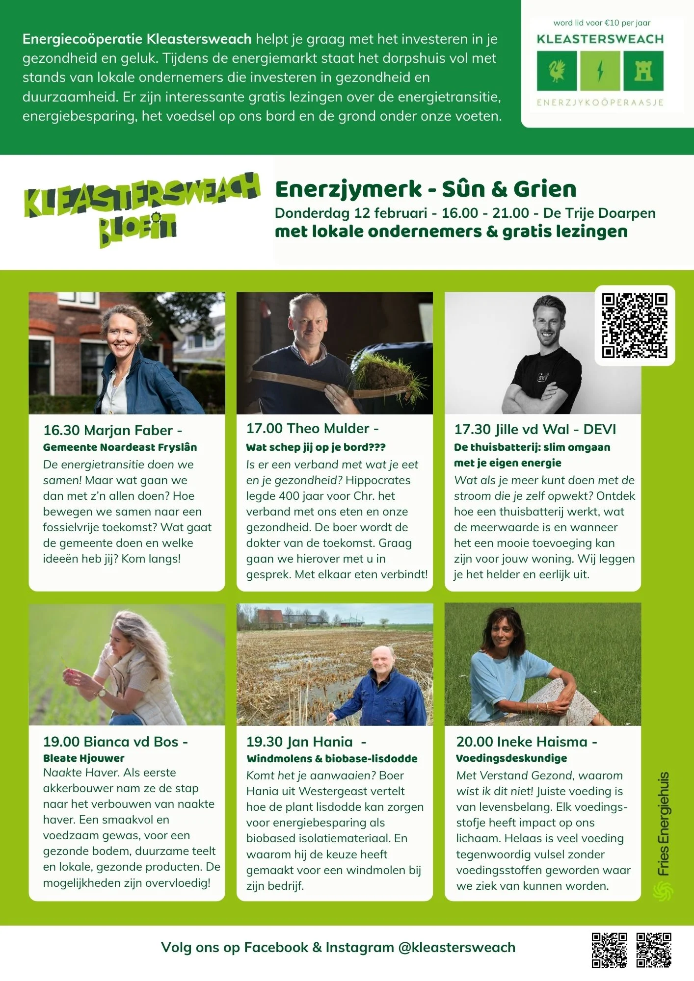 De Trije Doarpen Donderdag 16.00 tot 21.00 uur Tijdens de Sûn & Grien Enerzjymerke op donderdag 12 februari 2026 van 16.00 tot 21.00 uur in Dorpshuis De Trije Doarpen kun je: ✅ Advies krijgen |